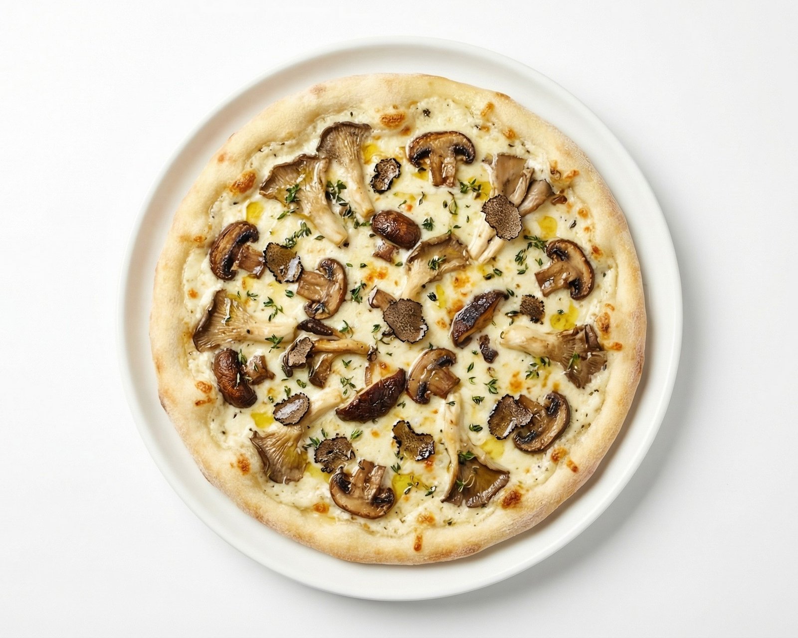 A luxurious white pizza with roasted wild mushrooms and truffle oil.